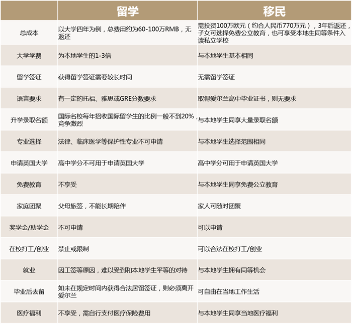 而對(duì)于以國(guó)際學(xué)生身份在海外接受教育的留學(xué)生來(lái)說(shuō),可能將會(huì)受到一些不公平的待遇。以愛(ài)爾蘭為例,選擇直接送孩子前往愛(ài)爾蘭留學(xué),和先為孩子規(guī)劃愛(ài)爾蘭身份,再到當(dāng)?shù)亟邮芙逃齼煞N方式之間,存在著巨大的差異: