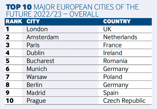 2月17日,《金融時報》旗下的《FDi Intelligence》發布最新《2022-2023年度歐洲未來城市和地區》報告,通過評估歐洲356個城市和148個地區,倫敦、阿姆斯特丹、巴黎、都柏林和布加勒斯特名列前茅,被評為歐洲五大最具投資價值城市。