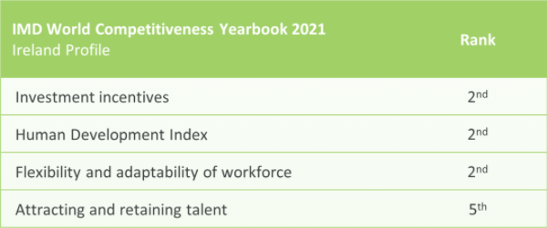 愛爾蘭長期位居世界上最適合商業發展的國家前列,有利于外商直接投資的增長。歷屆政府始終延續一致的親商政策。通過持續改善成本、生產力、生活質量等營商環境情況,愛爾蘭較之其它發達經濟體優勢明顯。愛爾蘭投資激勵位居世界第2,生活質量世界第2,員工靈活性與適應度世界第2,吸引和留住人才世界第5。