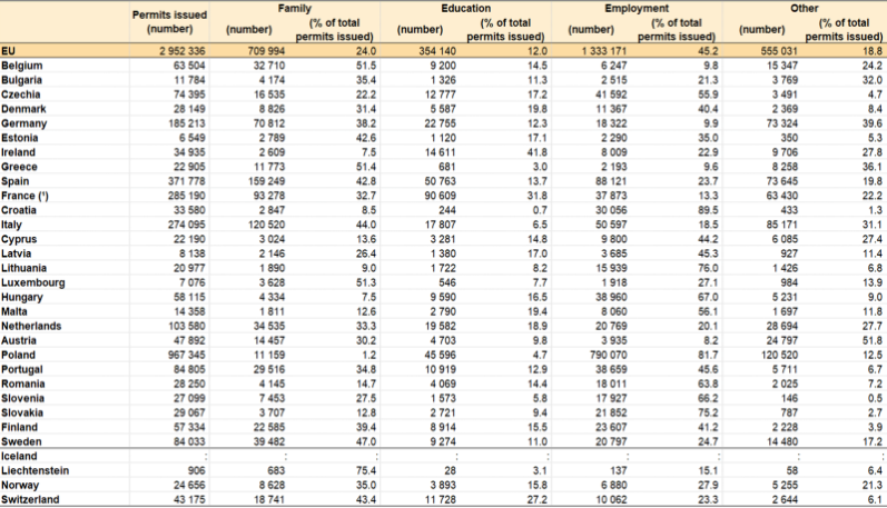 歐盟統計局在報告中將發放居留許可的主要原因歸類為:工作、家庭團聚、教育和其他。
