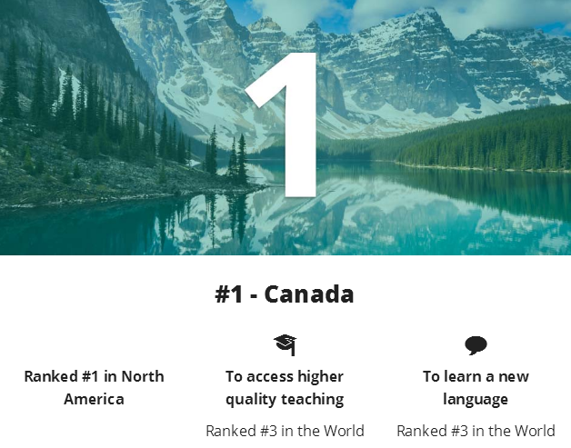 加拿大名校林立,著名的多倫多大學、麥吉爾大學、英屬哥倫比亞大學、滑鐵盧大學、阿爾伯塔大學、蒙特利爾大學、麥克馬斯特大學、皇后大學等,都是足以媲美美國常青藤大學的名校。