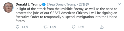 特朗普在推特上寫道,“鑒于‘這個(gè)看不見的敵人’(指新冠病毒)的攻擊,以及保護(hù)我們偉大的美國(guó)公民的工作需要,我將簽署一項(xiàng)行政命令,暫停移民入境美國(guó)!”