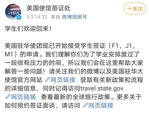 美恢復(fù)了對(duì)中國(guó)留學(xué)生的簽證工作