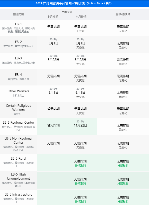 美國(guó)5月綠卡排期出爐