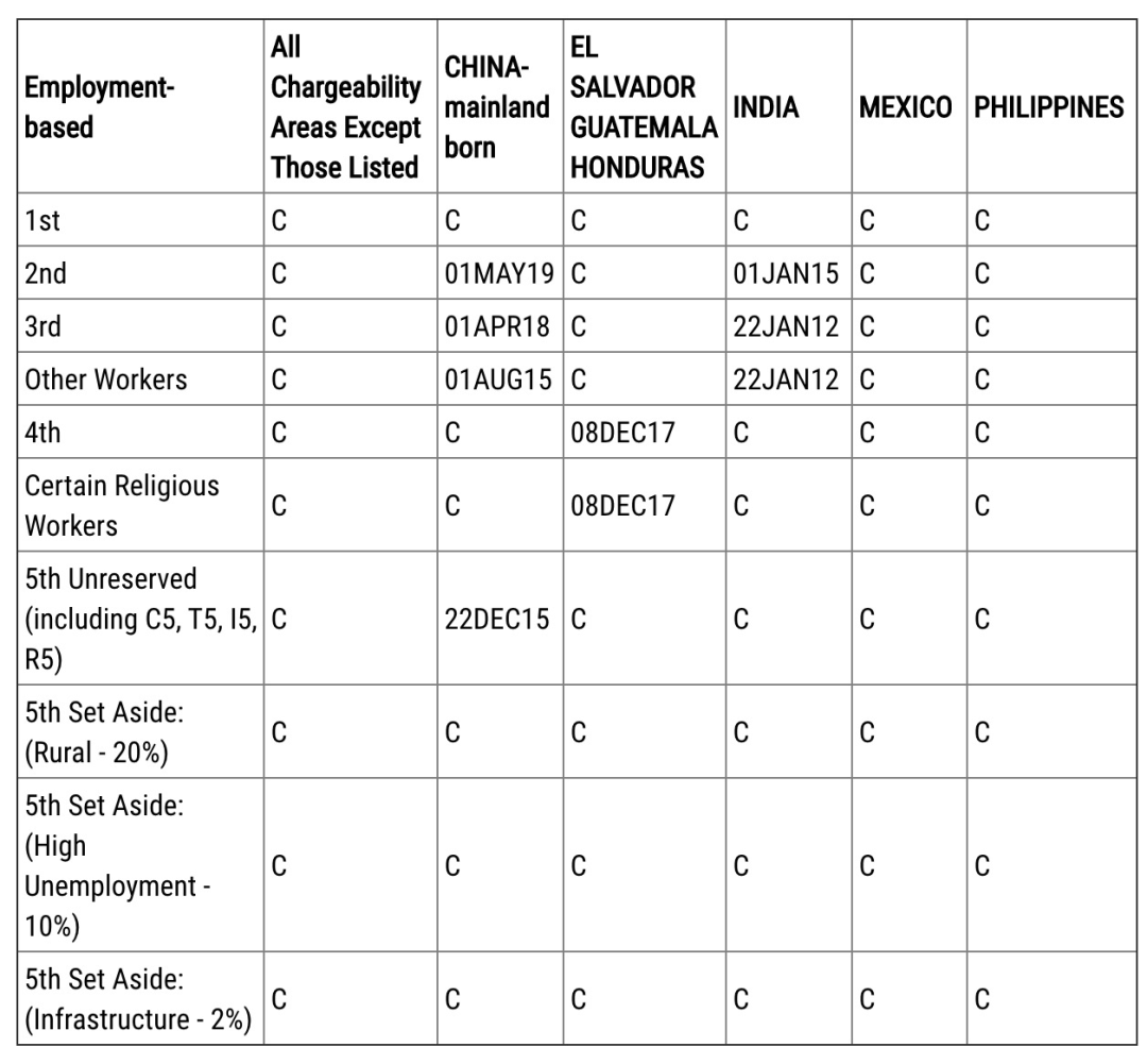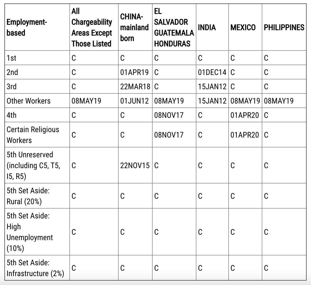 ·表B同樣除EB-2前進(jìn)1個(gè)月至2019年5月1日,其他各類簽證項(xiàng)目排期無變化。