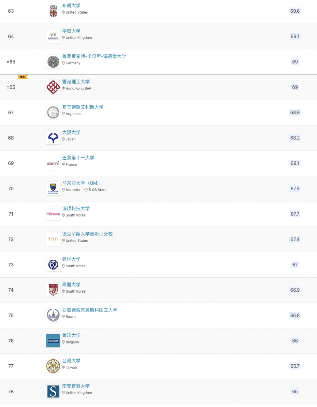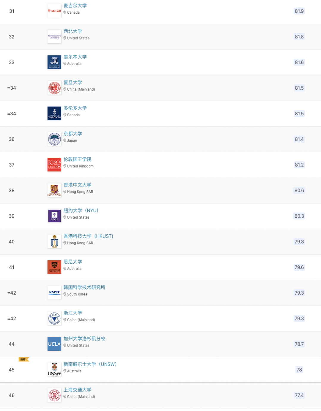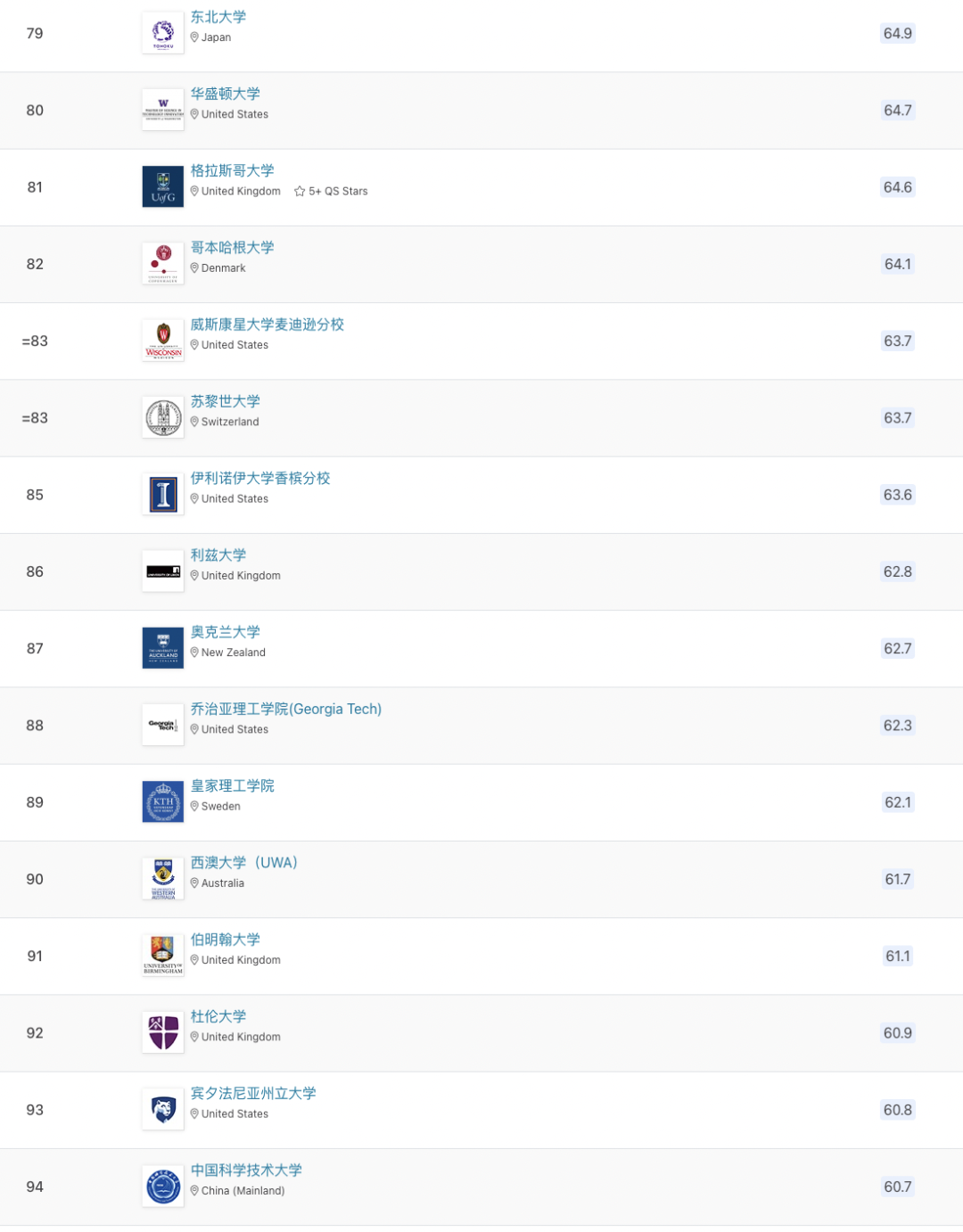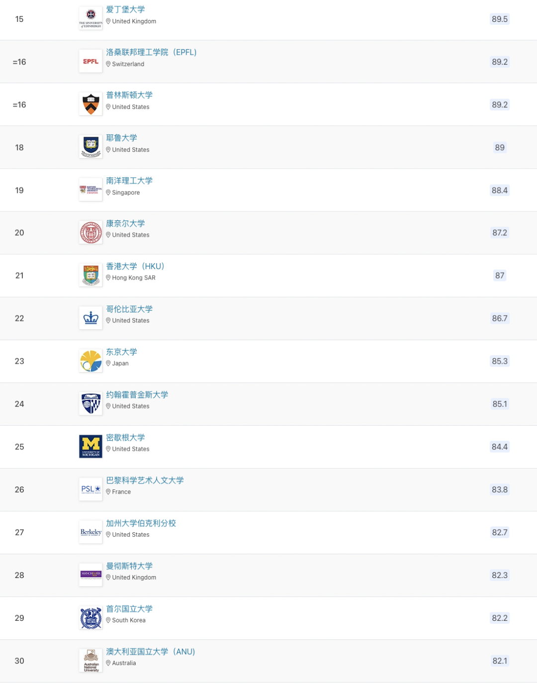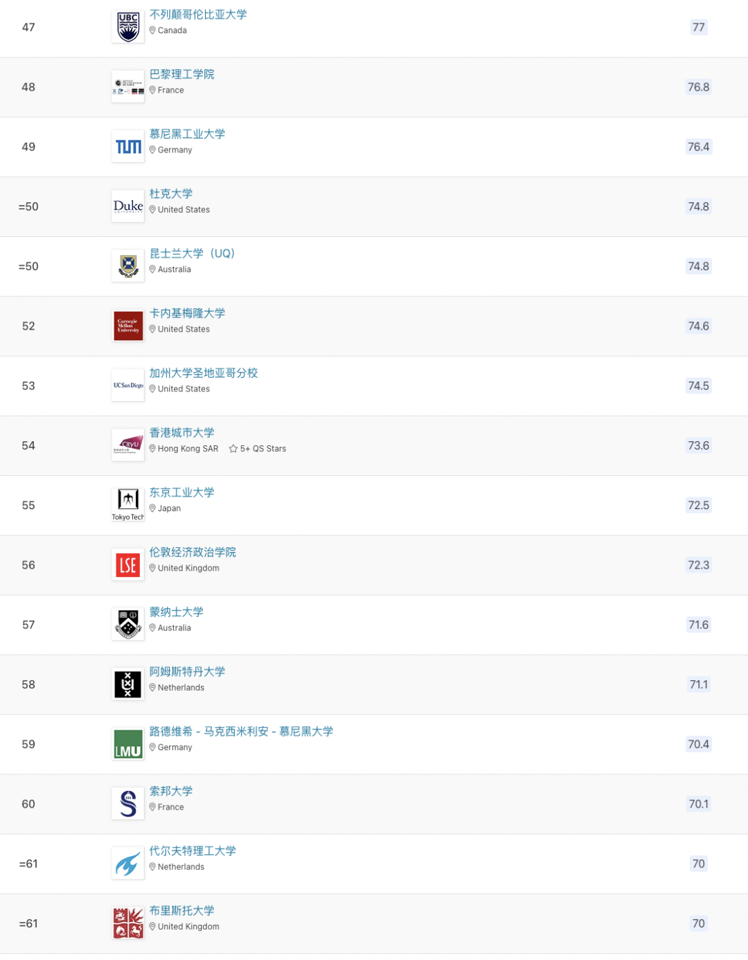 以下為世界前100所大學(xué)排名: