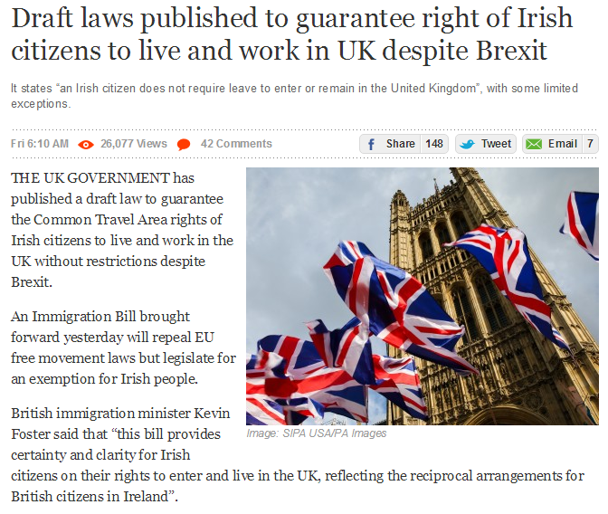3月5日,英國(guó)發(fā)布一項(xiàng)移民法案(草案),廢除歐盟的自由流動(dòng)法,但對(duì)歐盟國(guó)愛(ài)爾蘭除外。該法案再次重申,英國(guó)脫歐后,愛(ài)爾蘭公民依然可享受在英國(guó)自由定居、生活的共同旅游區(qū)(CTA)特權(quán)。而其他歐盟國(guó)公民,則需另行申請(qǐng)英國(guó)居留簽證才可定居英國(guó)。