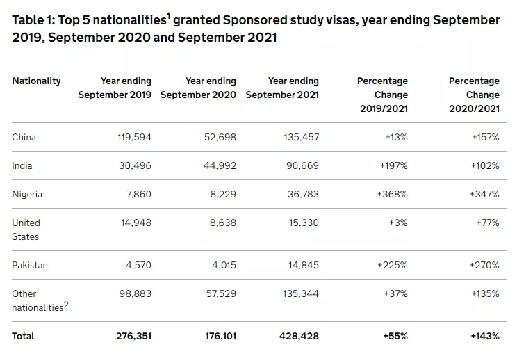 日前,英國內政部發布了最新的《學生簽證年度數據》。數據顯示,在截至2021年9月的一年中,內政部共計發放了428,428份學生簽證,創歷史新高!同比2020年暴增143%,比疫情前的2019年高出55%。
