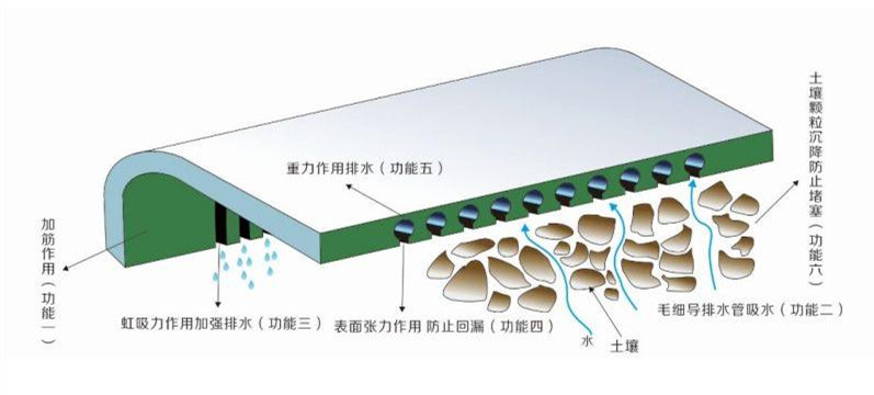本產(chǎn)品采用PVC高密度聚合材料,具有較好的韌性,埋于土中可以起到拉結(jié)土壤的作用(功能一);且一反傳統(tǒng)改采用密集溝槽,內(nèi)大外小的設(shè)計,且埋設(shè)時溝槽面向下,而使水流由下往上倒吸進入毛細導(dǎo)水管(功能二);如此一來土壤顆粒因重力自然沉淀不致隨同水流進入毛細導(dǎo)水管內(nèi),同時也不會在進水槽溝附近產(chǎn)生淤積現(xiàn)象(功能三);但是內(nèi)部溝槽既能進水,同時也造成漏水之后果,此時毛細防排水板則利用表面張力使水在溝槽上產(chǎn)生封閉效果不回漏(功能四);當水進入時,毛細現(xiàn)象會自然而然對土壤中的水分產(chǎn)生抽吸的效果,直到灌滿并以重力流向外排放(功能五);當水流到達出口將因落差產(chǎn)生虹吸作用,進一步對土壤內(nèi)部產(chǎn)生負壓,大幅增加吸排水效果(功能六)。